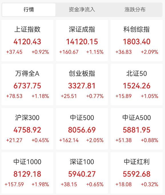 今日(1月9日),A股全天震荡走强。截至收盘,上证指数涨0.92%,日K线16连阳,站上4100点关口,最新报4120.43点。深证成指涨1.15%,创业板指涨0.77%。市场全天成交31523.68亿元,较昨日大幅放量3260.66亿元。